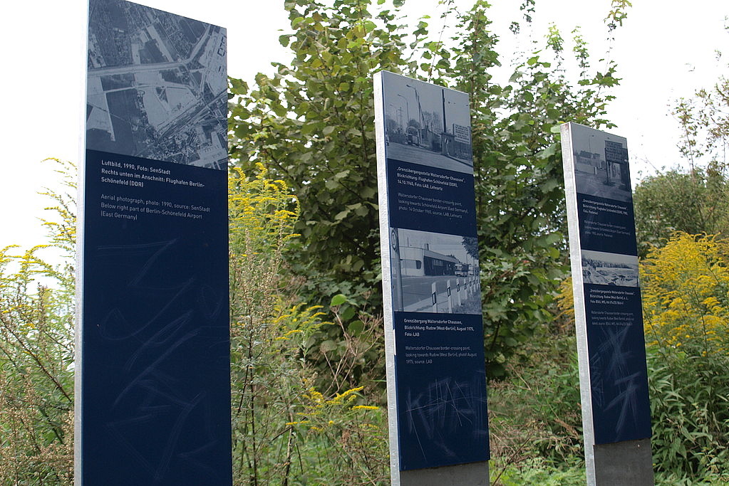 Von der Massantebrücke geht es die Kanalstraße entlang Richtung Rudower Höhe. Am Neudecker Weg stehen noch Mauerreste. Ein ganzes Stück weit verläuft der Weg parallel zur Autobahn. An der Waltersdorfer Chaussee erinnern Tafeln an den ehemaligen Grenzübergang, der den Zugang zum Flughafen Schönefeld ermöglichte.