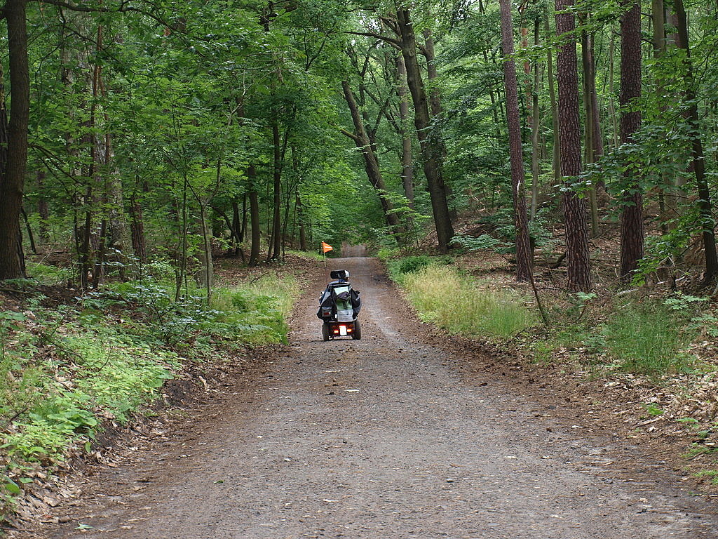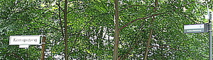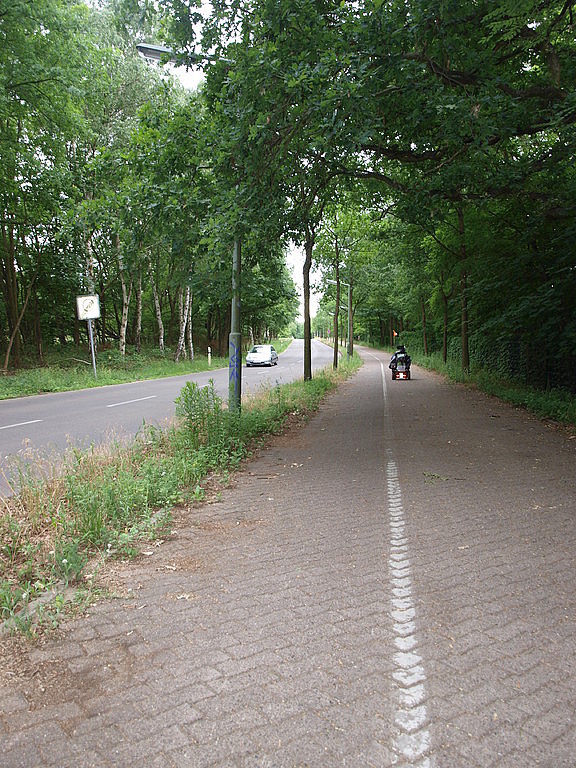 Wir nehmen wie geplant den Königsweg, der hinter der Benschallee beginnt. Er führt entlang der ehemaligen Stammbahn, der ersten Eisenbahn in Preußen, die ab 1838 Potsdam mit Berlin verband und vor dem Krieg das gehobene Bürgertum der Vorortvillen in 13 Minuten in die City bringen konnte. Daher auch der Name "Bankierszüge".