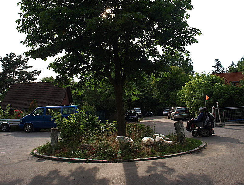 Zurück zur Machnower Straße und links ab in die Bernhard-Beyer-Straße nach Steinstücken. Steinstücken war eine zu West-Berlin gehörende Insel, umgeben von DDR-Gebiet. Ein Gebietsaustausch ermöglichte 1971 über die Straße einen direkten Zugang zum westlichen Stadtgebiet. Die Kontrollen fielen weg, Steinstücken wurde ein beliebtes Ausflugsziel. Es war schon ein eigenartiges Gefühl: Eine kurze Strecke nur, eine Straße, auf beiden Seiten die Mauer, am Ende ein Wendekreis und das Ganze zurück.