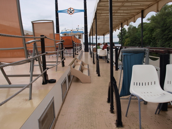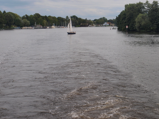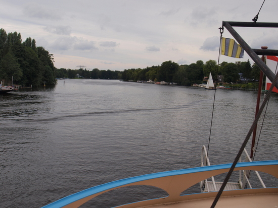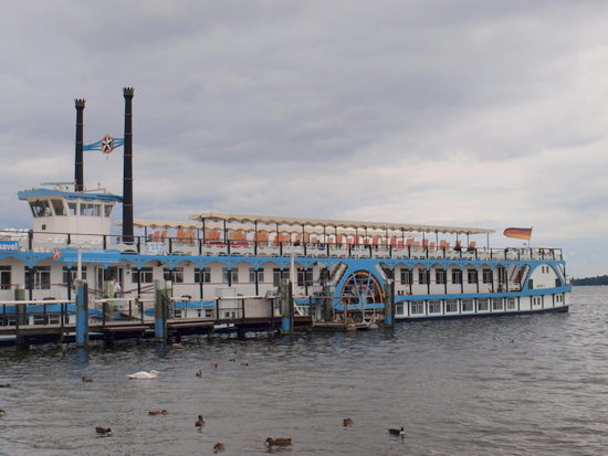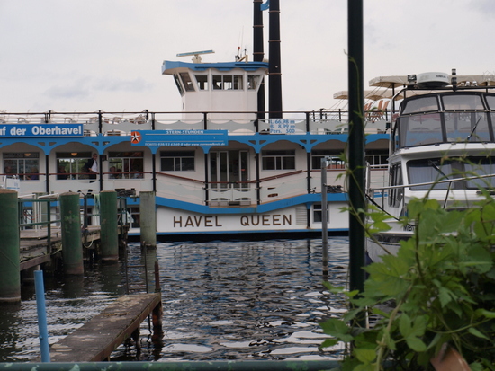 Die Havelqueen, ein Raddampfer, bietet zweistündige Touren an, von der Greenwichpromenade in Tegel nach Nieder Neuendorf und zurück.