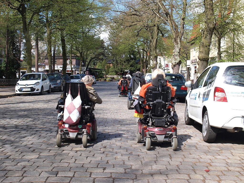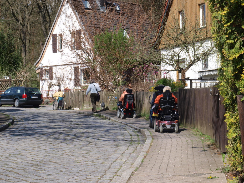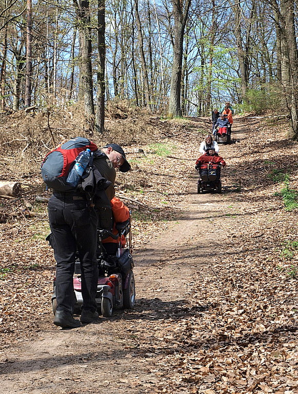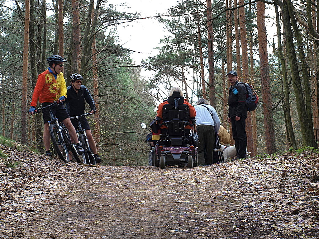 Bald werden wir merken, wie gut es ist, dass unsere Gruppe diesmal relativ klein ist, die begleitenden Fußgänger werden voll beschäftigt sein mit sichern, halten oder schieben. Der Weg gleicht zum Teil einer alpinen Abfahrt, an der steilsten Stelle auch noch mit kleinen Stufen, die man kaum sieht, aber nichtsdestotrotz nicht übersehen sollte. Eins ist sicher: Langweilig ist diese Tour nicht. Nach etwa zwei bis drei Stunden folgt dann das Sahnehäubchen zum Genießen, das Tegeler Fließ.