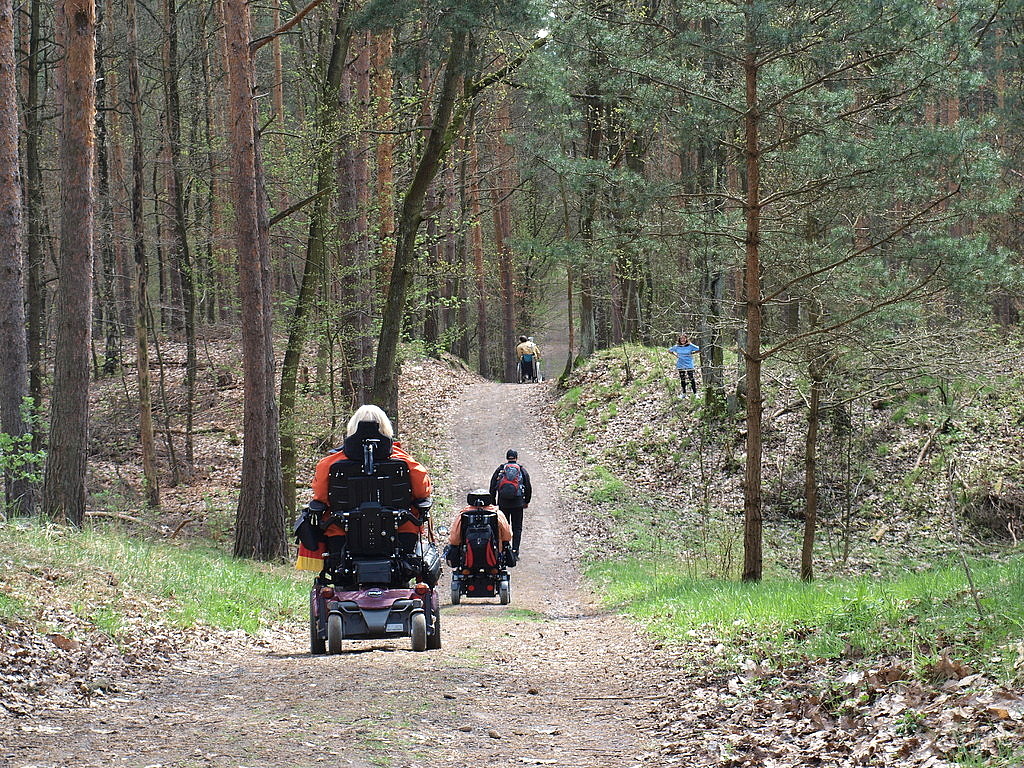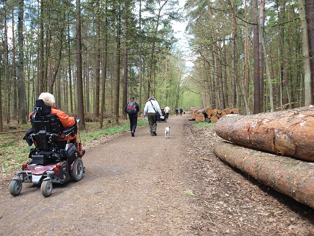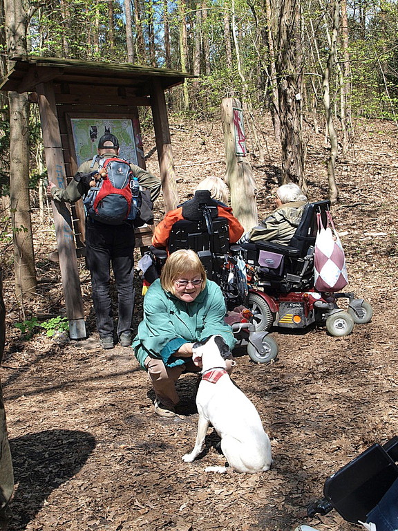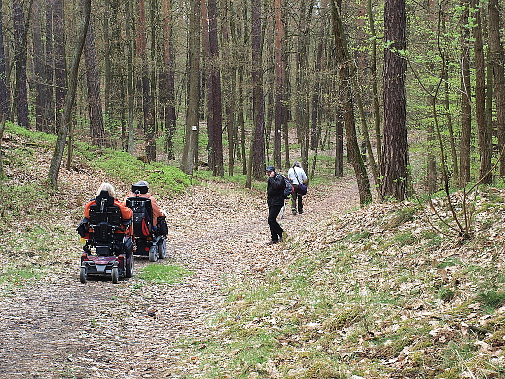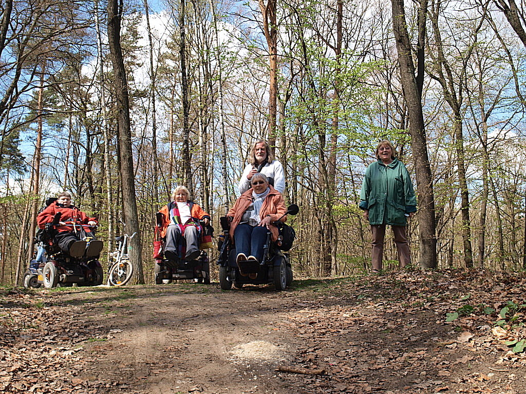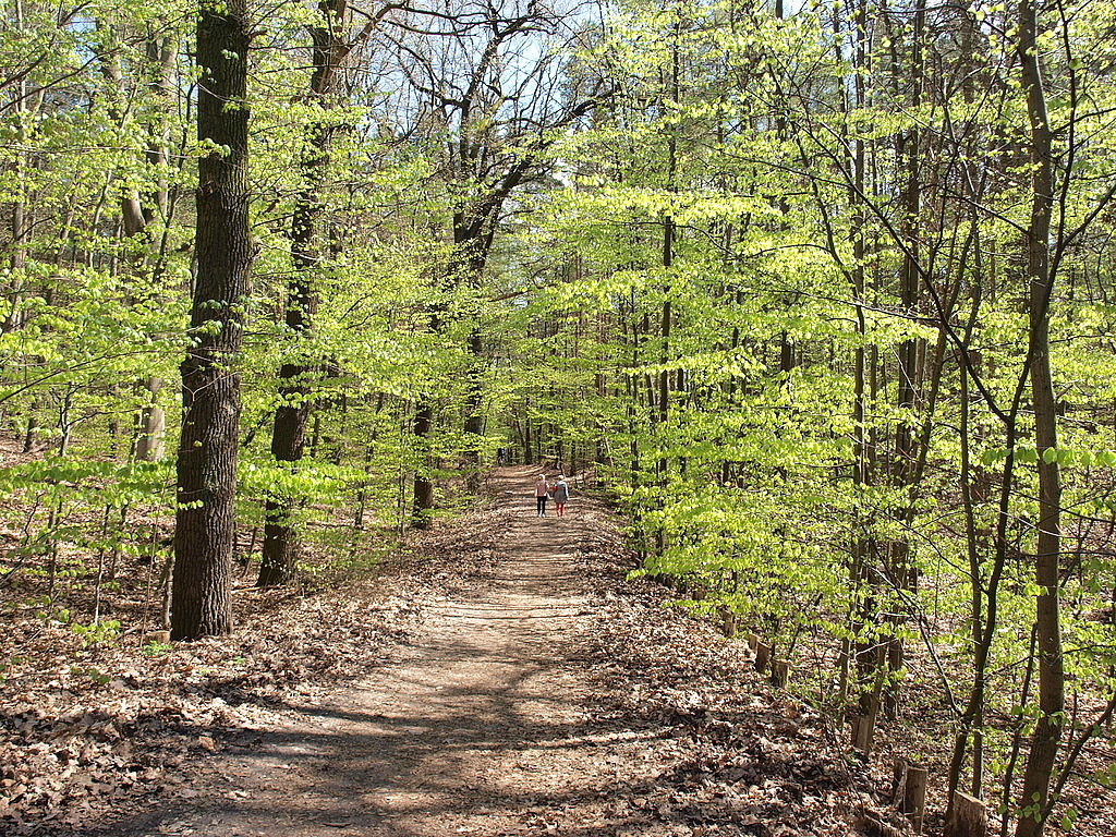 Vom Hermsdorfer Damm biegen wir rechts ab in die Martin-Luther-Straße, kurz darauf Am Buchenberg noch einmal nach rechts und schon tauchen wir ein in das frische Grün, das noch genug Sonne durchlässt. Noch ist der Weg flach und bequem. Ich versuche, mir die Stellen zu merken, wann wir wo abbiegen, gebe aber bald auf. Wer sich hier auf den Weg macht, sollte unbedingt eine gute Karte, ein Navi oder einen Kompass dabei haben und auf keinen Fall allein sein.